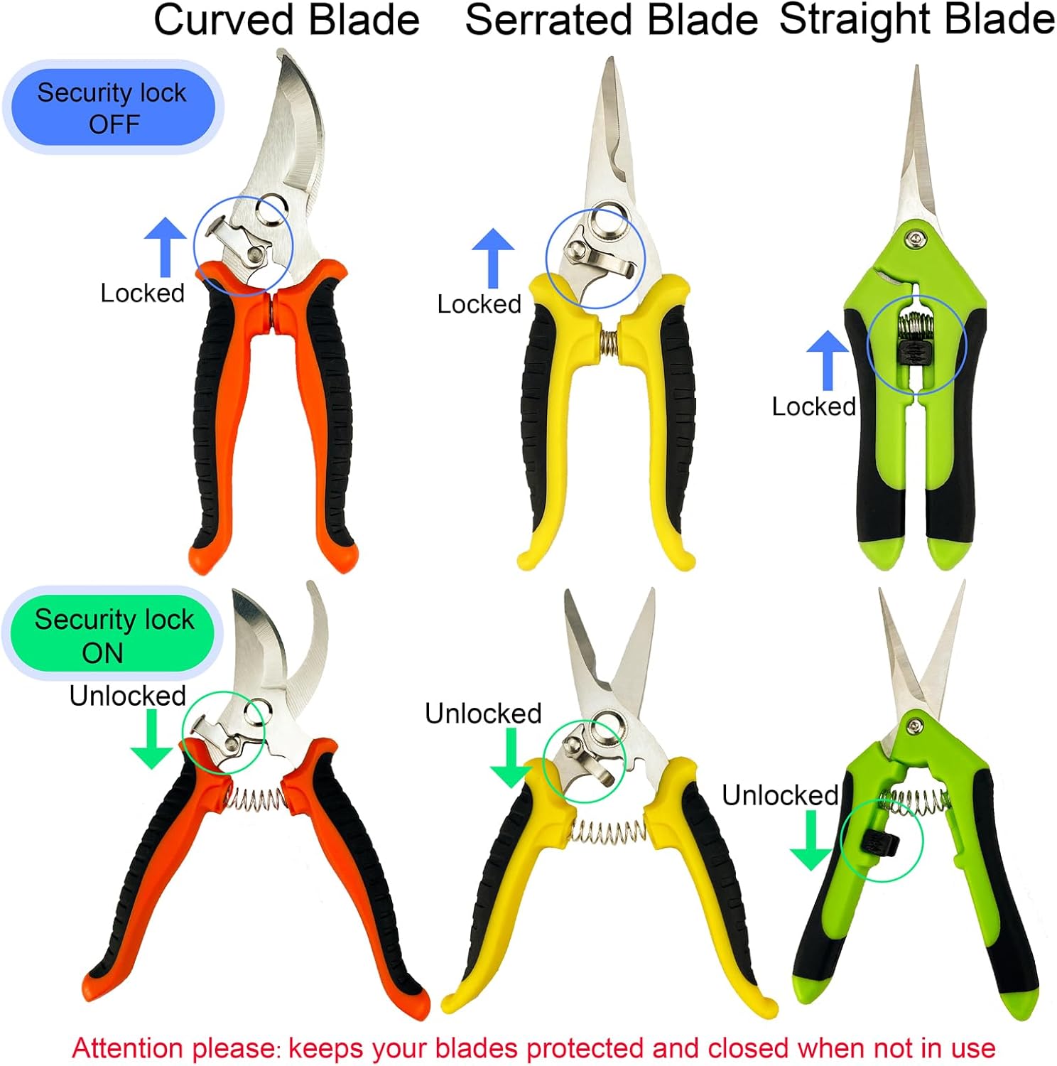 Pruning shears for gardening include 3 different blades and gloves for a variety of general pruning work. Great for trimming flowers, plants, bonsai, hydroponics, herbs, light branches and so on. Shears gardening tools are ideal for pruning needs and perfect gift for gardening friends